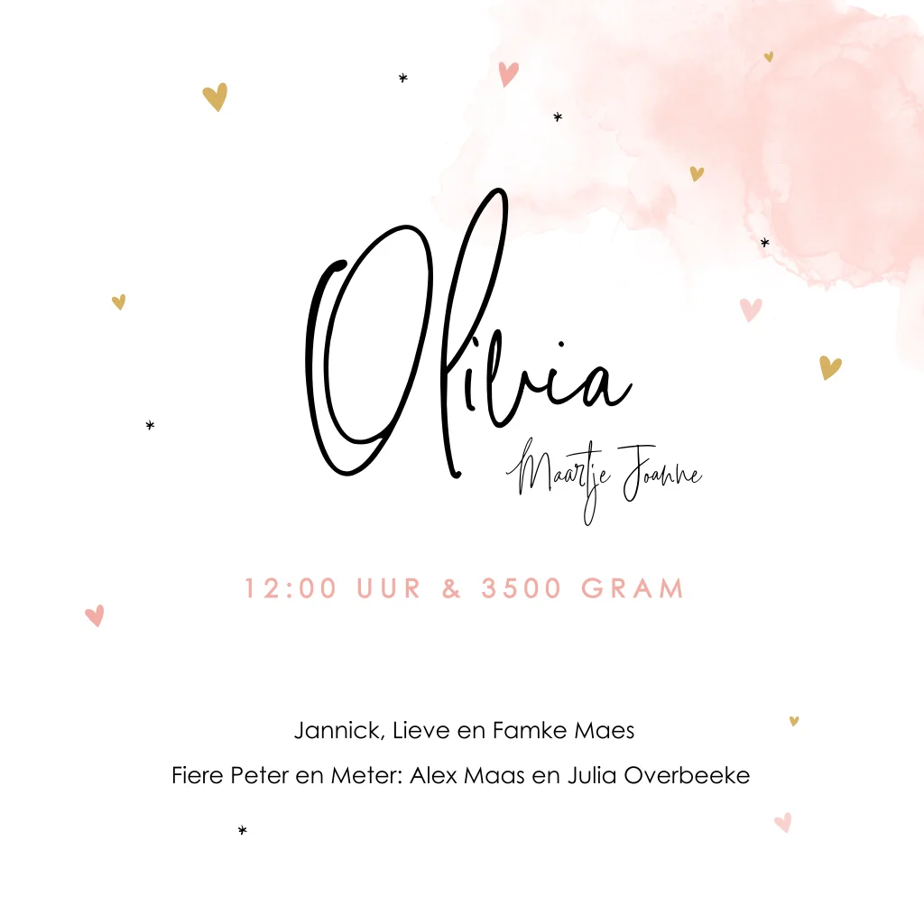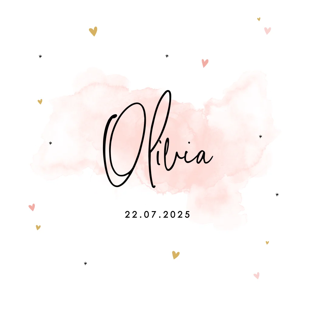 Wat een lief babykaartje voor de geboorte van jullie dochter! De naam van jullie meisje staat in sierlijke letters geschreven op een wolk van roze aquarel. Daaromheen staan lieve kleine hartjes. Pas de teksten gemakkelijk aan in de online editor en ontwerp zo jullie unieke geboortekaartje!