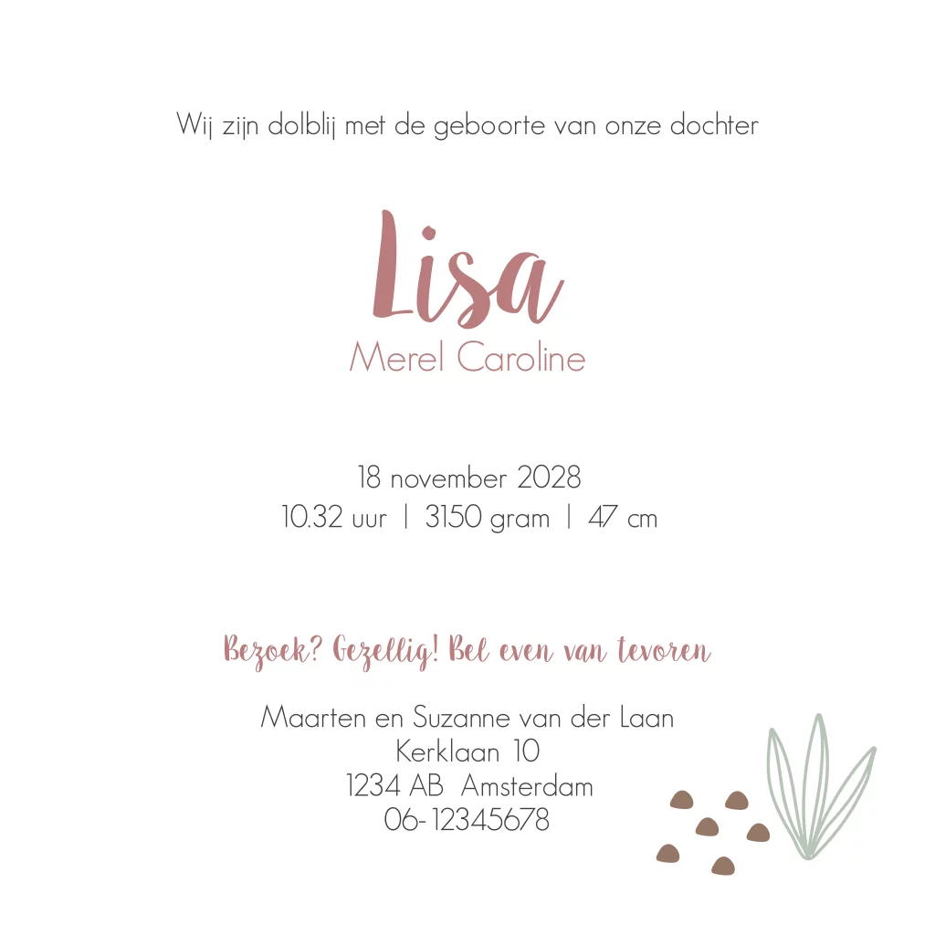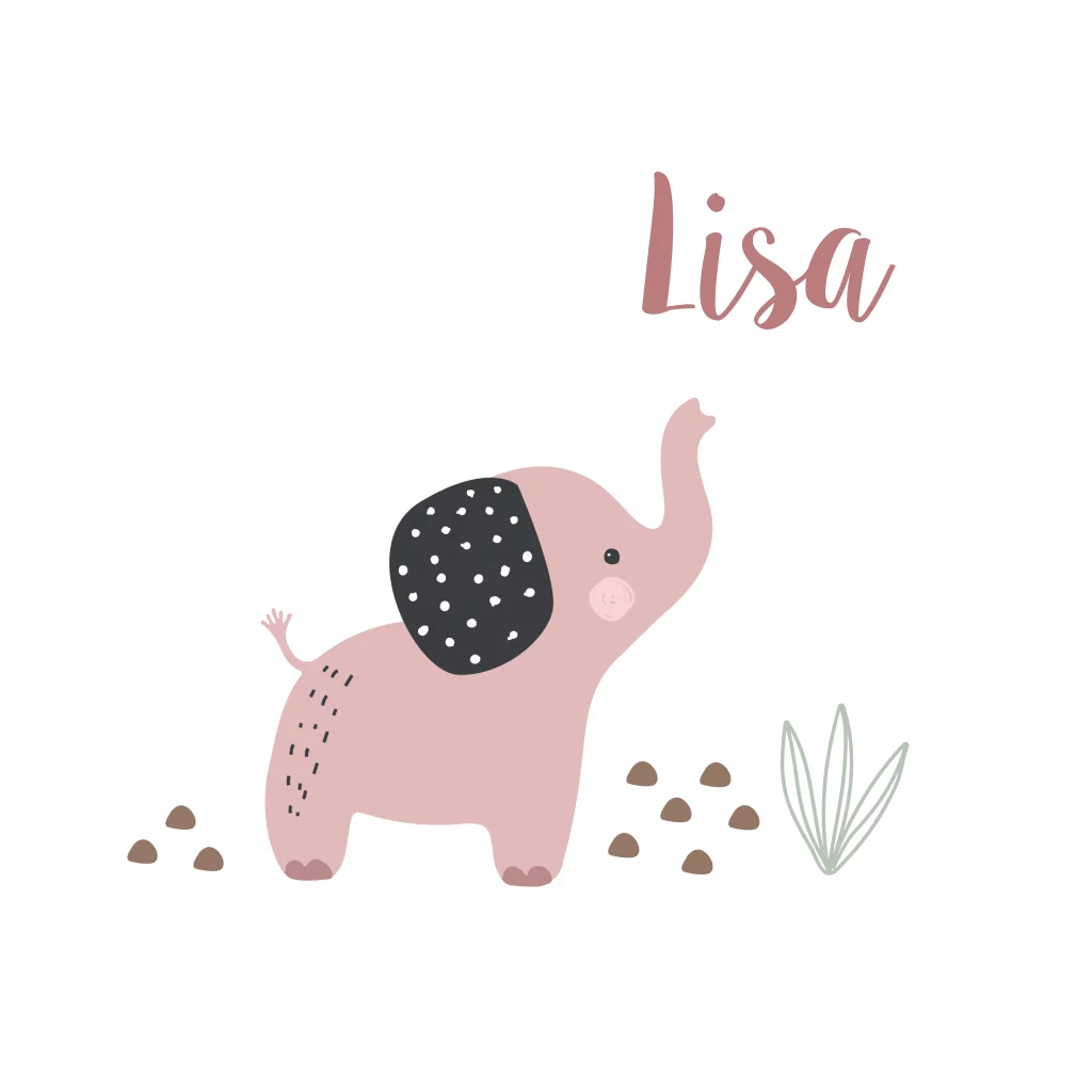 Grappig geboortekaartje voor een dochtertje: een lief roze olifantje wandelt voorbij, de slurf wijst naar de naam van jullie meisje. Het oor van de olifant is in zwart met witte stipjes, ook aan de binnenzijde is het design terug te vinden. Pas de teksten aan in de online editor en bestel een proefdruk.