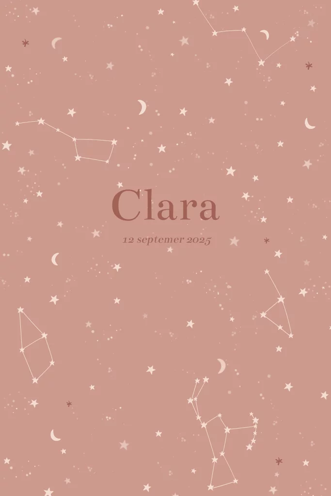 A new star is born, jullie dochtertje! Op dit roze geboortekaartje staat een prachtig patroon van een sterrenhemel, met maantjes en sterrenbeelden in lichtroze. De achterkant van de kaart is ook lichtroze en de tekst is in bijpassende kleuren, pas deze naar wens aan in de online editor.