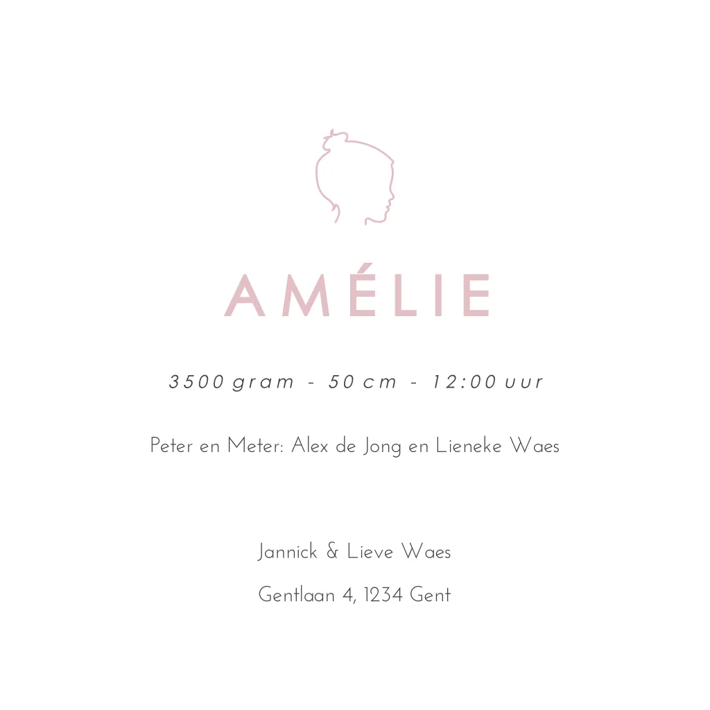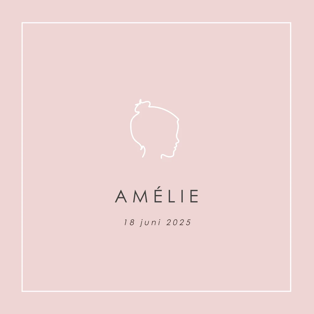 Stijlvol en tijdloos, dit geboortekaartje voor een dochtertje! Op het zachtroze kaartje staat een witte lijntekening van een meisje, langs de rand staat een subtiel wit kader. De binnenzijde is afwisselend roze en wit, pas de tekst naar wens aan in de online editor en bestel een proefdruk.