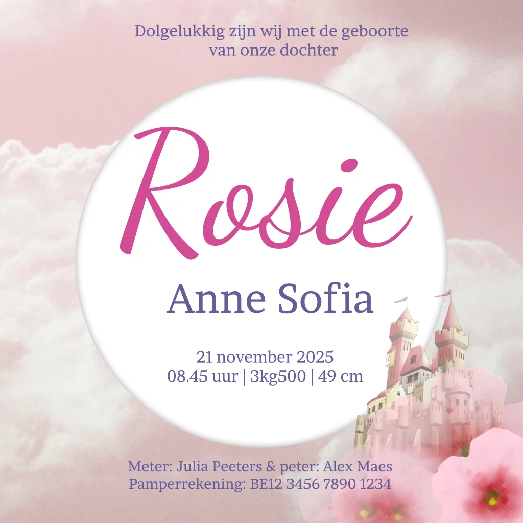 Geboortekaartje met sprookjes-kasteel voor meisje