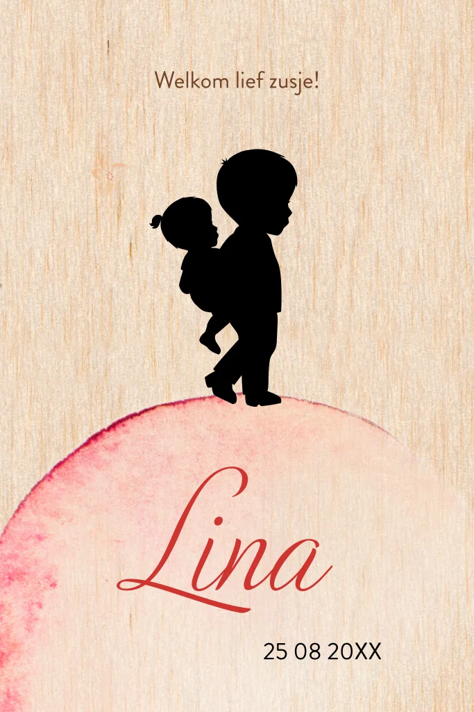 Silhouet geboortekaartje voor meisje met haar grote broer op hout