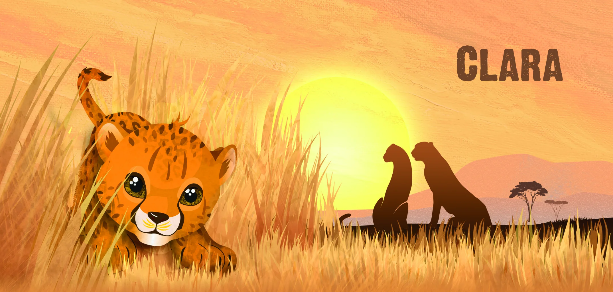 Uniek babykaartje met illustratie van een cheetah welpje in het gras op de savanne. Op de achtergrond staan vader en moeder cheetah met de zon erachter. Pas de teksten op dit kaartje aan en maak zo je eigen unieke ontwerp.