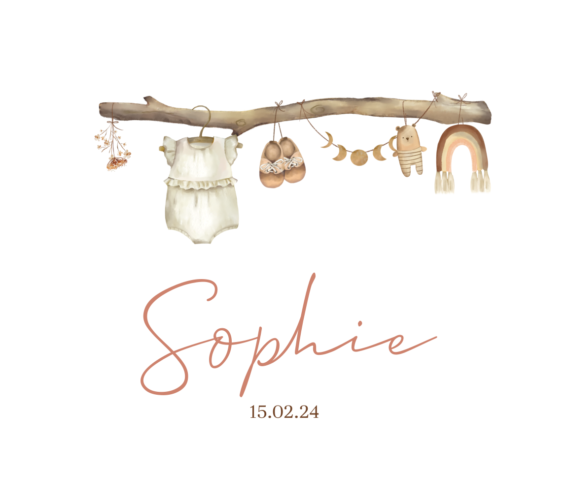 Lief geboortekaartje voor een meisje. Op de witte achtergrond staat een grote tak waar babykleertjes, maantjes, een knuffeltje en regenboog hangen. De naam van jullie kleintje staat in sierlijke letters eronder.