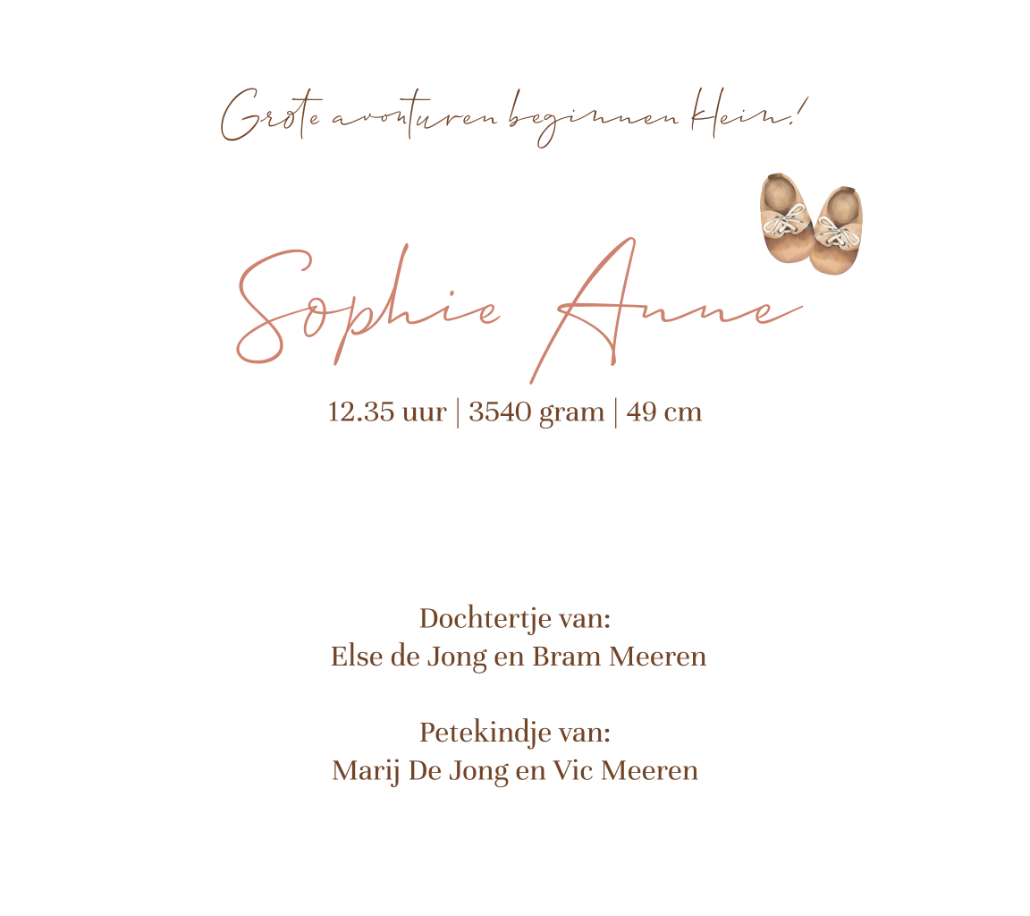 Lief geboortekaartje voor een meisje. Op de witte achtergrond staat een grote tak waar babykleertjes, maantjes, een knuffeltje en regenboog hangen. De naam van jullie kleintje staat in sierlijke letters eronder.Totaalprijs: 0 |