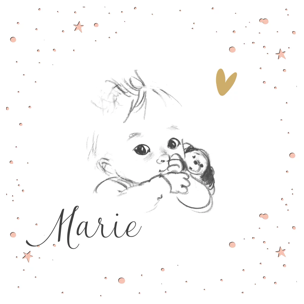 Wat een schattige geboortekaart voor jullie dochter! Met illustratie van een lief meisje met knuffel op een witte achtergrond met roze sterren en stipjes. Pas eenvoudig zelf de tekst en de typografie aan in de online editor.