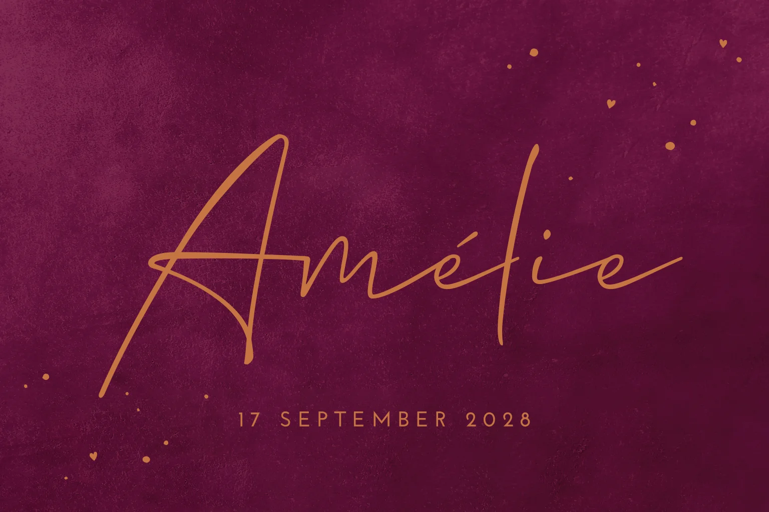 Stoer geboortekaartje voor een meisje met een velvet-look achtergrond in het paars. De naam van jullie dochtertje wordt in sierlijke letters gedrukt. Verander het geboortekaartje naar je eigen wensen in de online editor.
