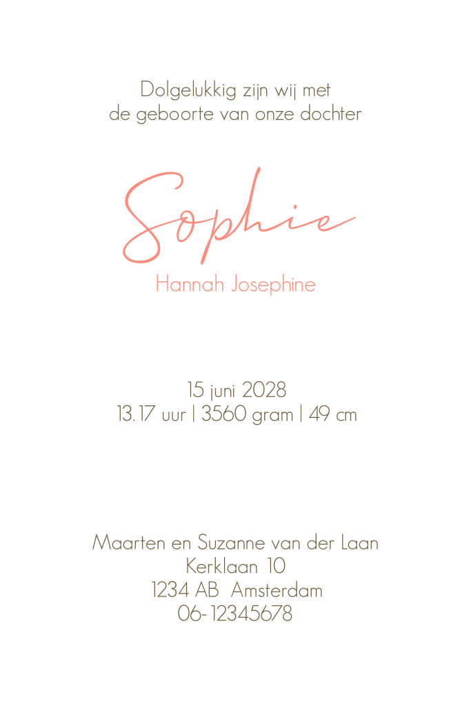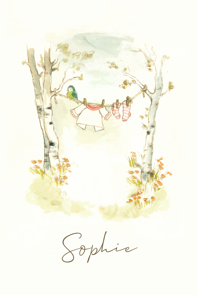 Romantisch, dit geboortekaartje voor een dochter met kleurrijke aquareltekening! Tussen twee bomen hangt een waslijn met kleertjes voor een meisje, ernaast is nog plek voor een lief vogeltje. Het waslijntje staat ook aan de binnenkant, de tekst is in bijpassende kleuren en kan naar wens worden aangepast in de online editor.