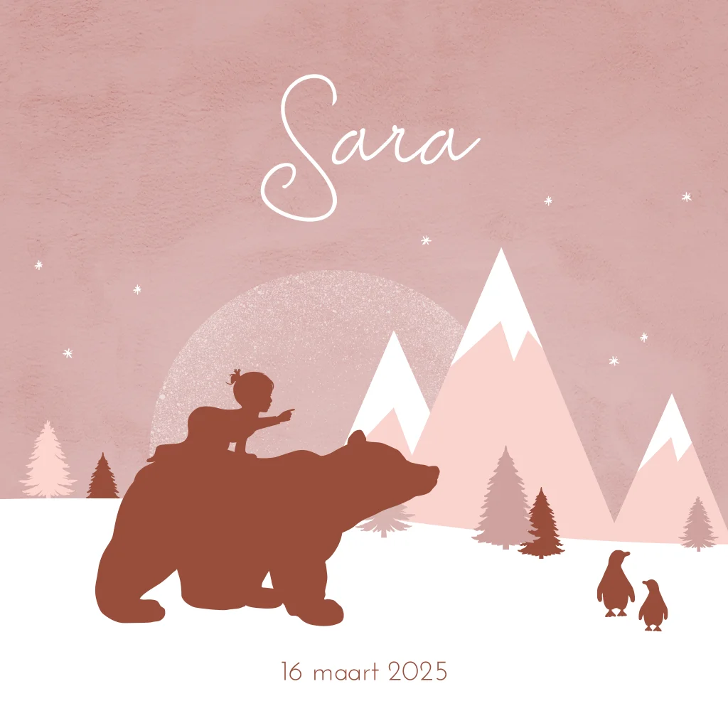 Trendy babykaartje voor de geboorte van jullie dochter. Op het kaartje staan de silhouetten van een klein meisje op de rug van een beer en twee pinguïns. Ze staan in een sneeuwlandschap met bergen en bomen. Op de achtergrond de maan en sterretjes. Pas de teksten op dit kaartje naar wens aan in de online editor.