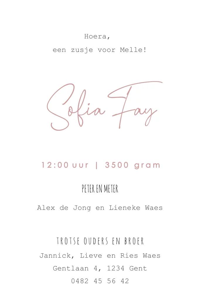 Lief kaartje voor de geboorte van een babyzusje! Onder de sterrenhemel een mooi getekende illustratie van grote broer en kleine zus. Verschillende elementen zijn in luxe goudfolie, ook aan de binnenzijde, gecombineerd met roze tekst.