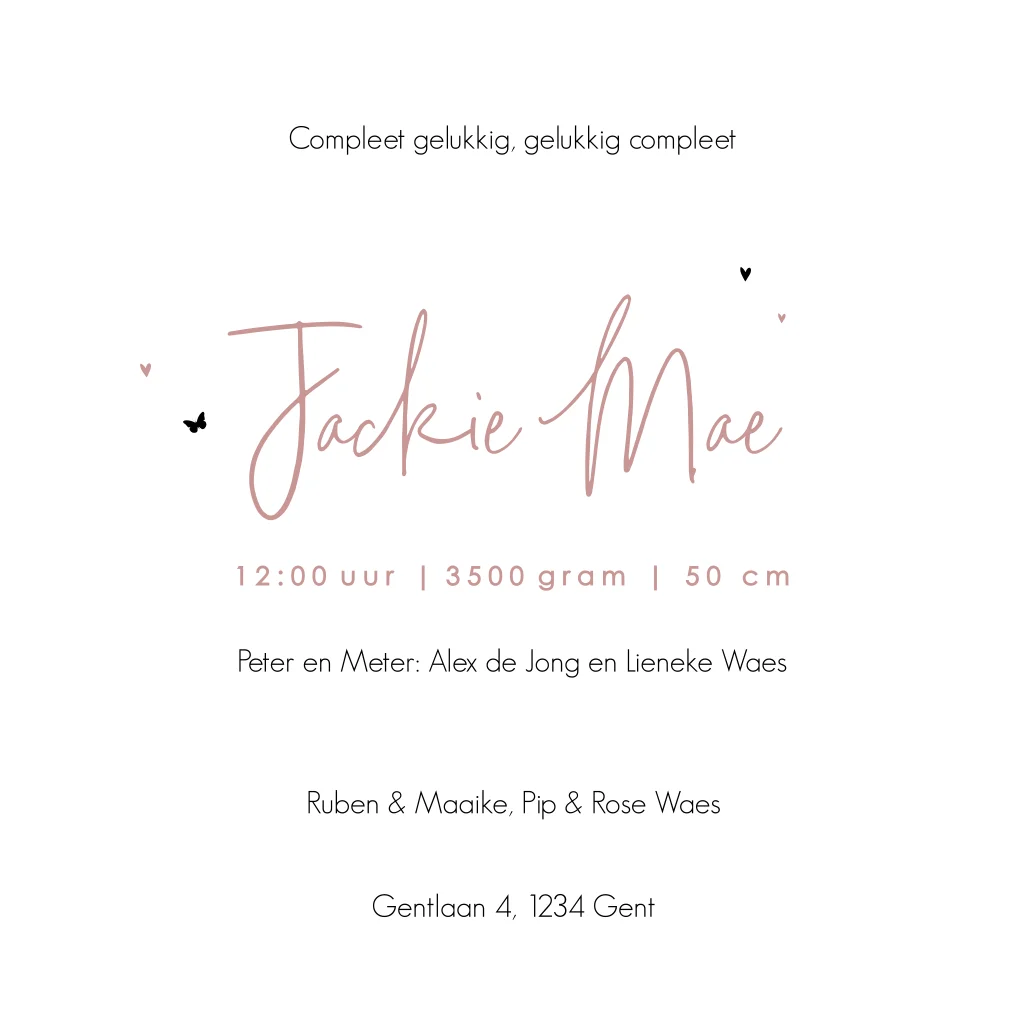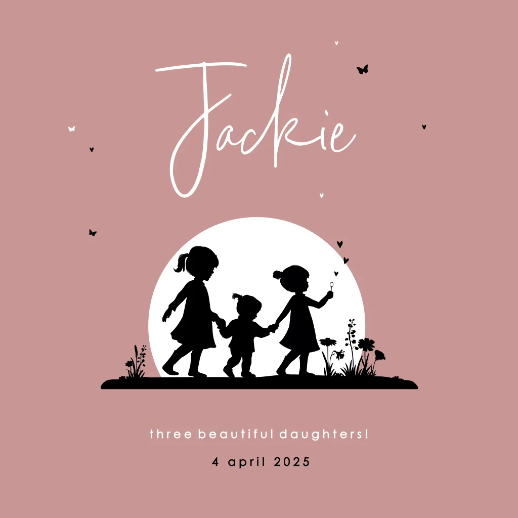 Wordt jullie derde dochtertje geboren? Dit lieve oudroze kaartje met silhouet van drie meisjes pas daar perfect bij! In een landschap met bloemetjes lopen drie meisjes in zwart silhouet, erboven vrolijke vlinders en lieve hartjes.