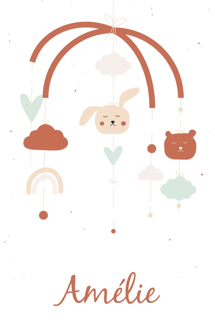Wat een vrolijk geboortekaartje voor een meisje, dit kaartje met mobiel! Op een witte achtergrond staat een kleurrijke mobiel met wolkjes, regenboog, hartjes, konijn en beertje. Een deel van de mobiel is in luxe goudfolie, voor een extra feestelijk accent.