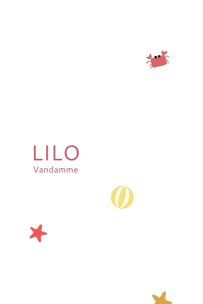 Hoe gaaf is dit geboortekaartje in zeethema! Dit kaartje heeft ronde hoeken, zeesterren, een strandbal en een schattig krabbetje. Bewerk het ontwerp naar eigen wens in de editor.