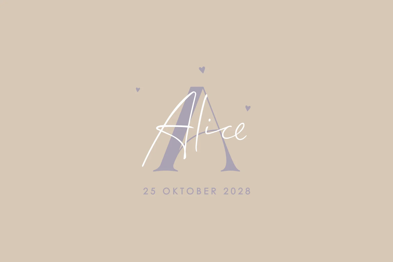 Minimalistisch geboortekaartje voor jullie dochter met prachtige paarse details. De achtergrond van het geboortekaartje heeft een neutrale kleur beige.