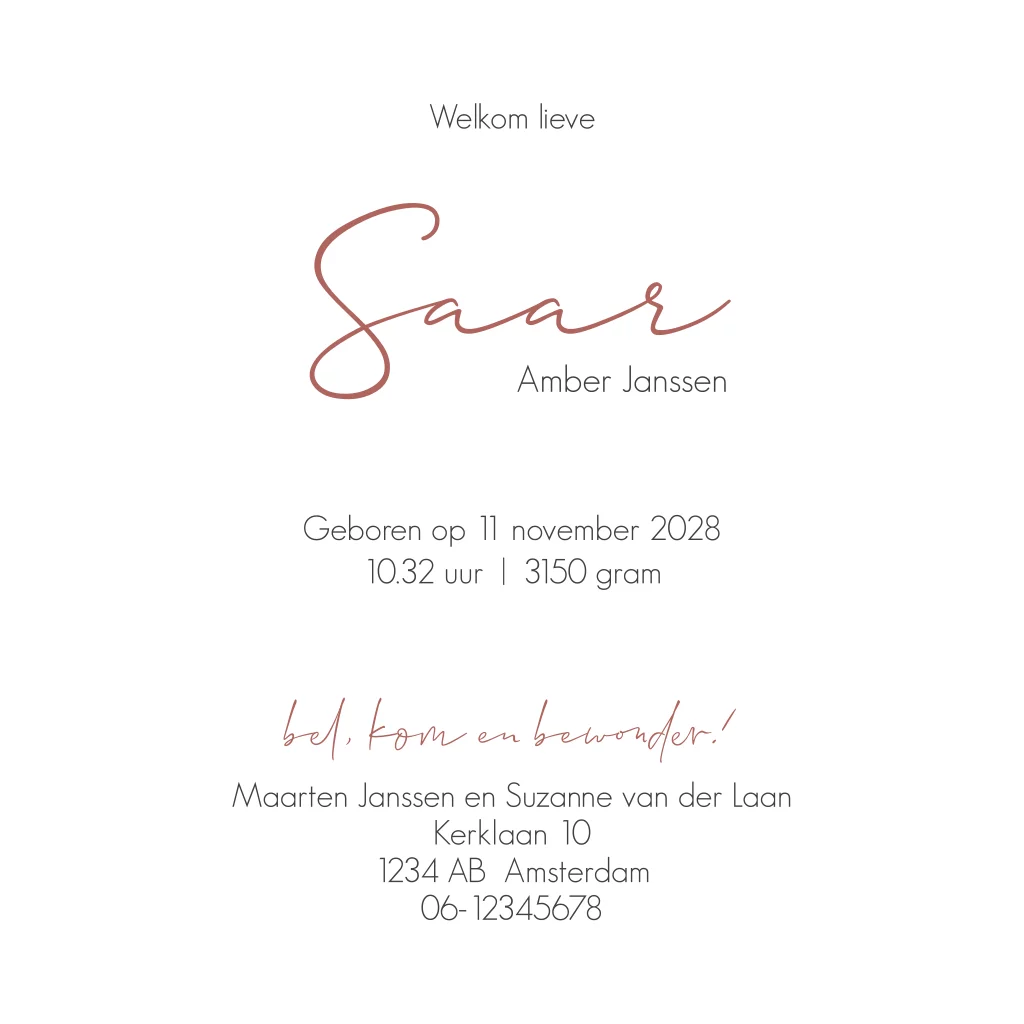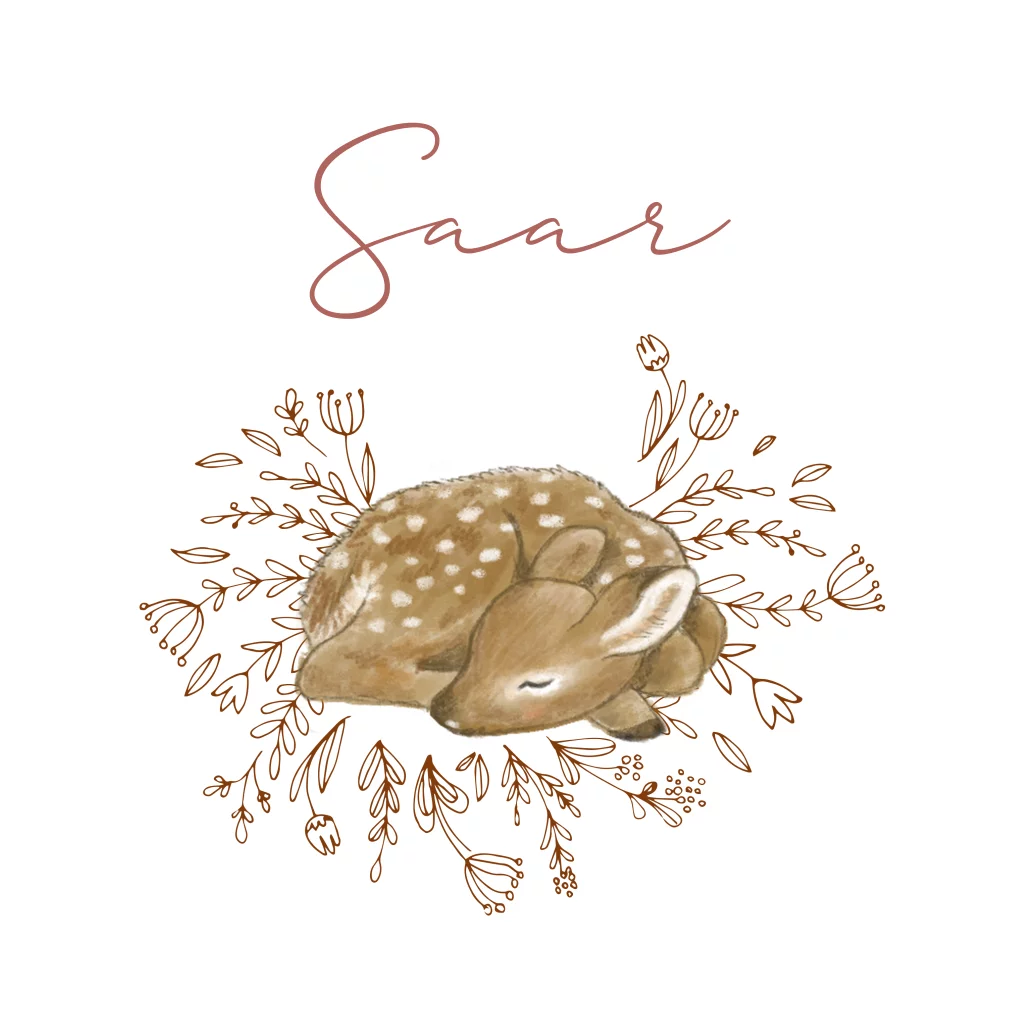Lief geboortekaartje voor jullie kleintje, op het witte kaartje staat een getekende krans van takjes en bloemen in bruin, in de krans ligt een klein hertje te slapen. Het design staat ook aan de binnenzijde, mooi met een roestbruine enveloppe!