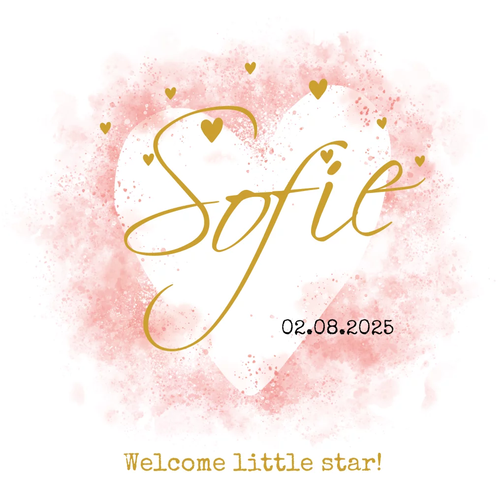 Een stijlvol en romantisch geboortekaartje met roze watercolour, een groot hart en kleine hartjes en teksten in goudlook. Leuk voor een meisje! Pas de tekst eenvoudig zelf aan in de online editor.Wist je dat we ook een bijpassend babyborrelkaartje hebben?