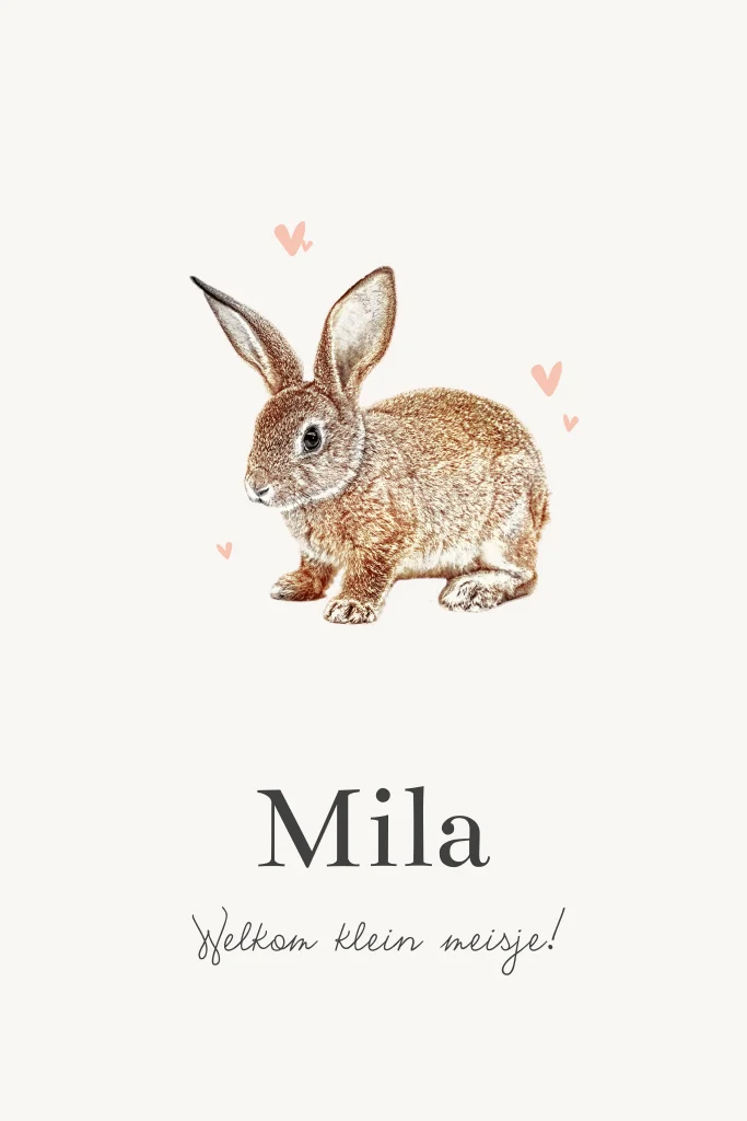 Dit geboortekaartje is perfect voor de geboorte van jullie kleine meisje. Het lieve getekende konijn, de lichtroze hartjes en de ronde hoeken geven dit kaartje een zachte uitstraling.
