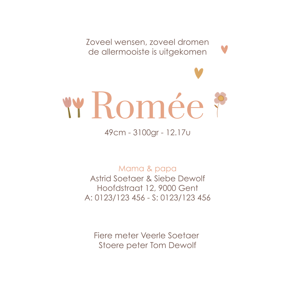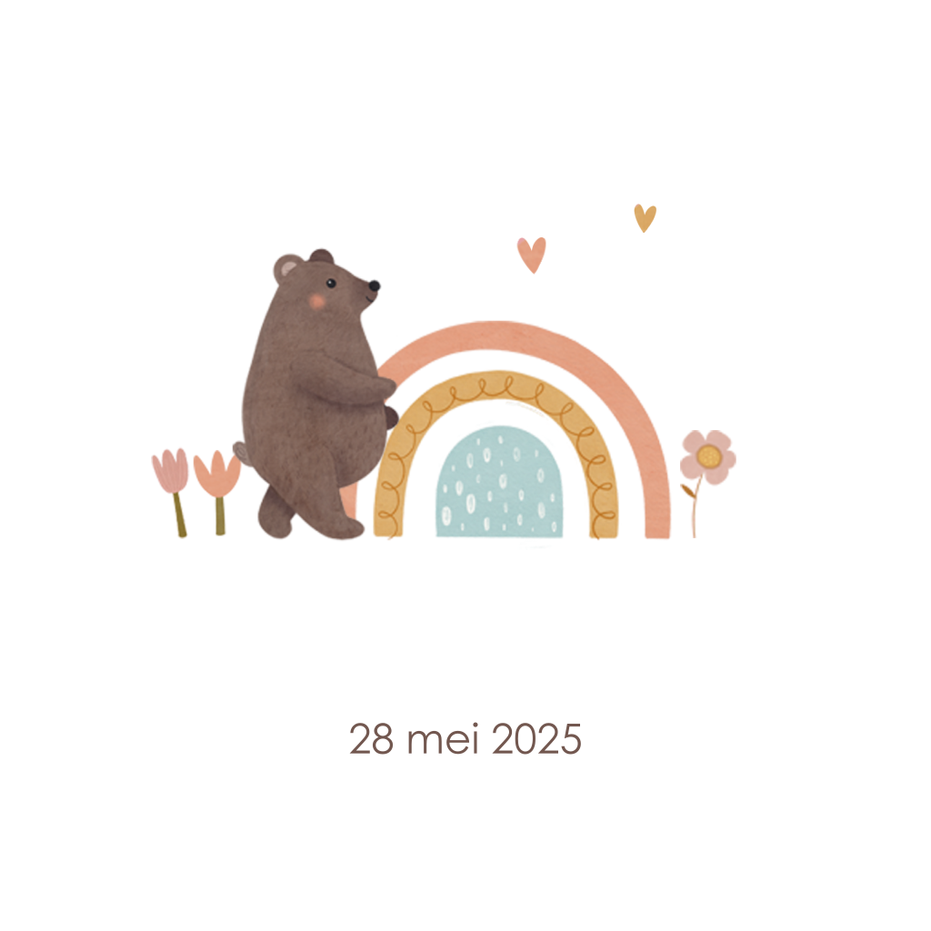 Schattig geboortekaartje met getekend beertje en regenboog. Om de beer en de regenboog staan vrolijke bloementjes. De naam van jullie kindje wordt in roségoudfolie gedruk.