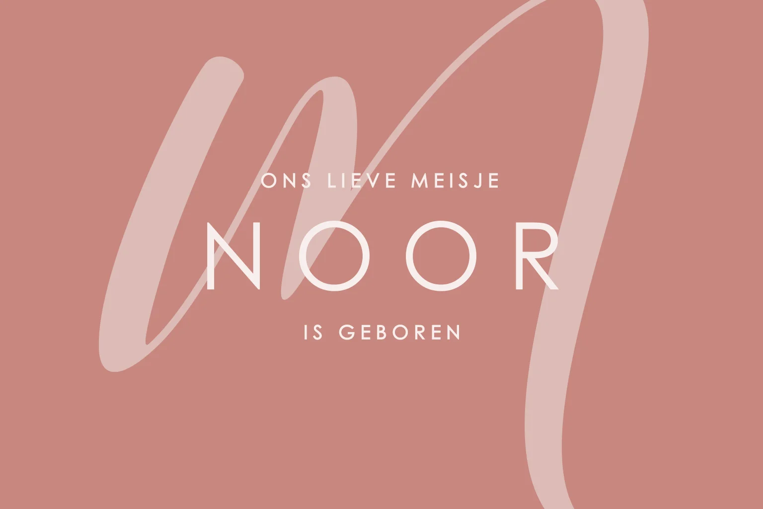 Schattig geboortekaartje voor een meisje met een zachtroze kleur. De initiaal van de naam van jullie kleintje staat in een sierlijke letter op de achtergrond.