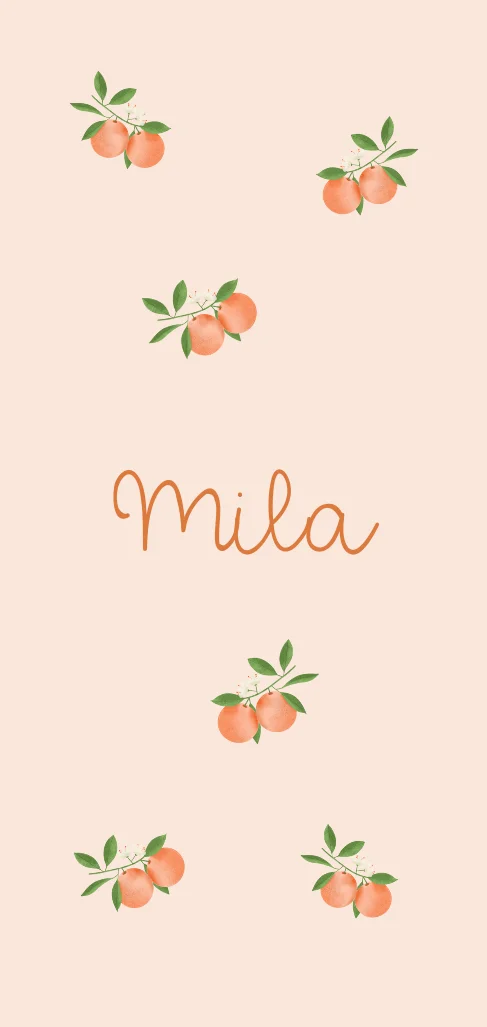 Lief, langwerpig geboortekaartje met ronde hoeken en kleine sinaasappels. Schrijf de naam van jullie pasgeboren kleintje in sierlijke letters in het midden en stuur deze kaart naar vrienden en familie.