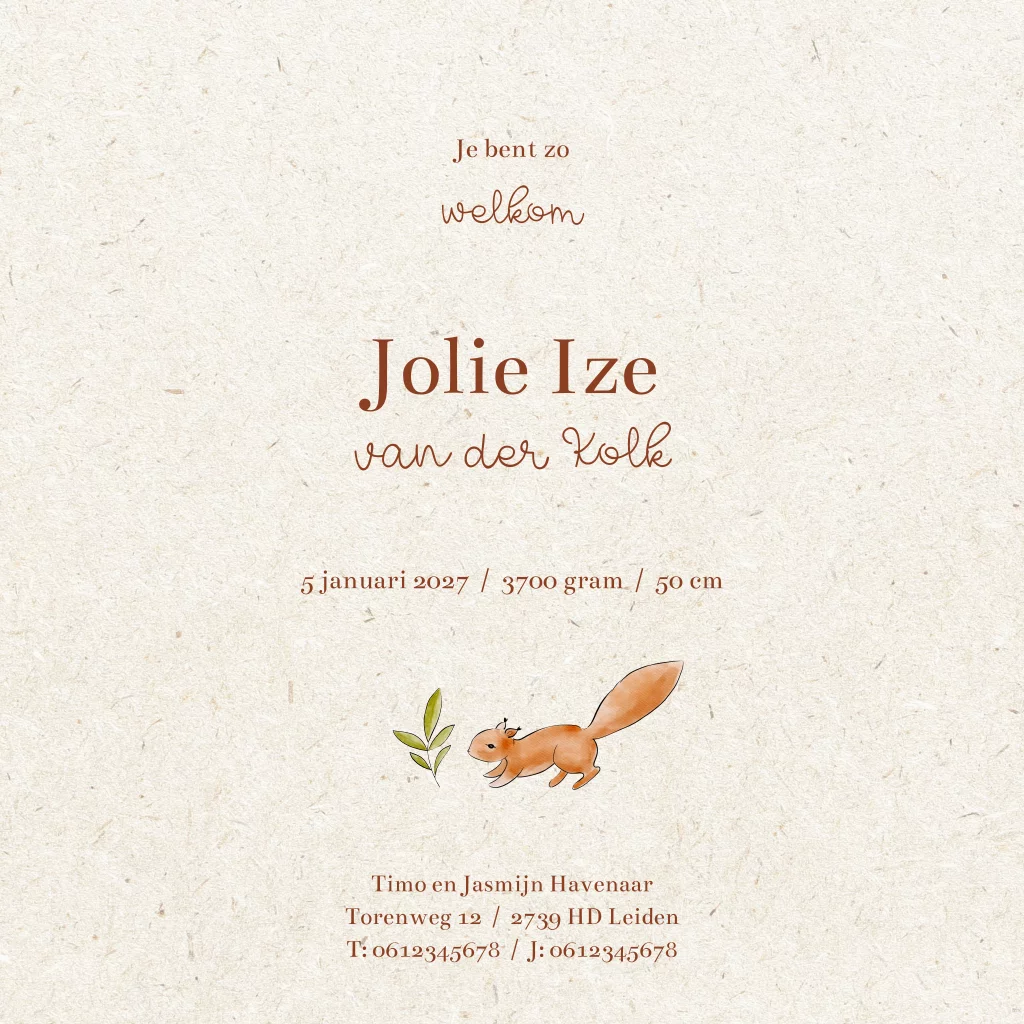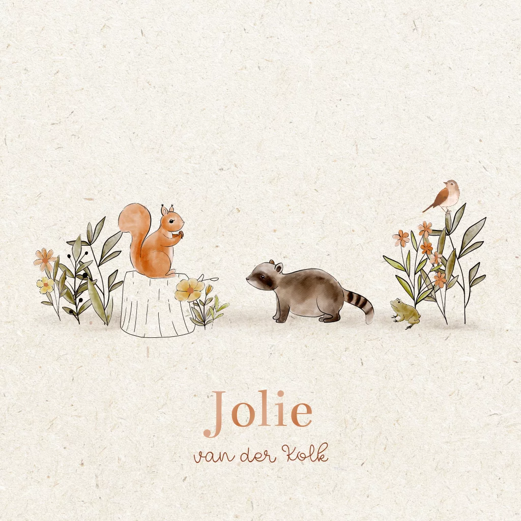 Een lief geboortekaartje met verschillende bosdieren! Perfect voor jullie dochtertje of zoontje. Pas het kaartje gemakkelijk aan in onze online editor.