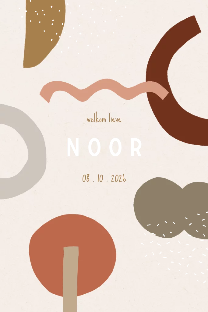 Geboortekaartje met vrolijke vormen en kleuren om de geboorte van jullie kindje mee aan te kondigen. Het babykaartje heeft ook goudfolie aan de binnenkant. Je kunt de tekst, het lettertype, maar ook de kleuren van de vormen en de foliekleur gemakkelijk aanpassen in de editor.