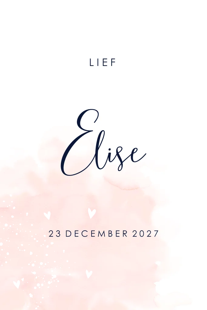 Lief geboortekaartje met roze watercolour, hartjes en goudfolie
