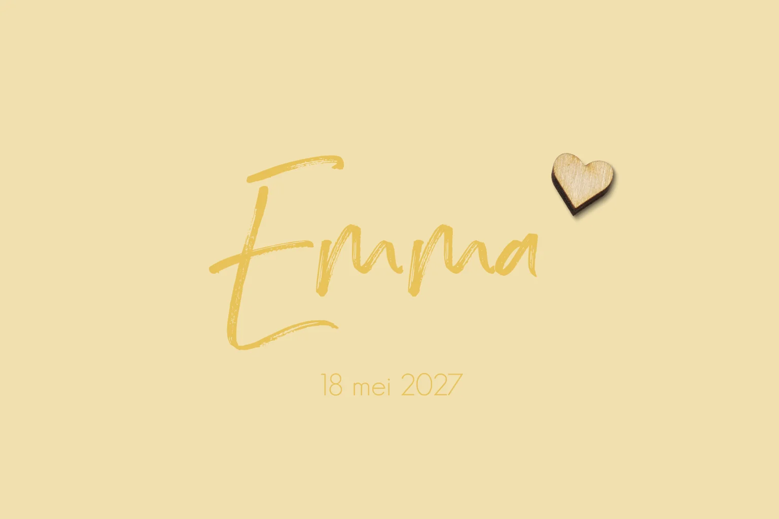 Zomerse babykaart met houten hartje naast de naam op een gele achtergrond. Lees hieronder hoe het werkt.