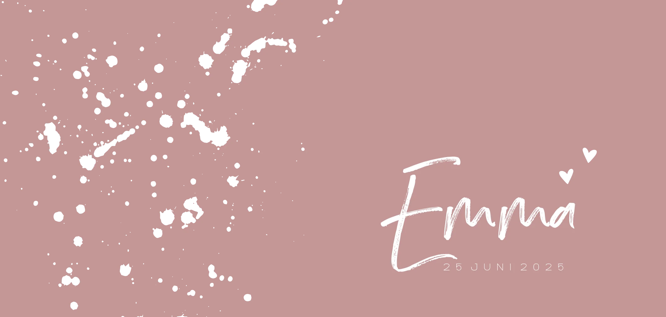 Trendy oudroze geboortekaartje voor een meisje met spetters in goudfolie. Het kaartje heeft afgeronde hoeken, waardoor het een lieve uitstraling krijgt. De tekst staat in sierlijke witte letters, de achterkant van de kaart is wit met de naam in roze letters. In de online editor pas je eenvoudig lettertype, tekst en kleuren aan. Zo gedaan!Bekijk ook onze babyborrelkaartjes.