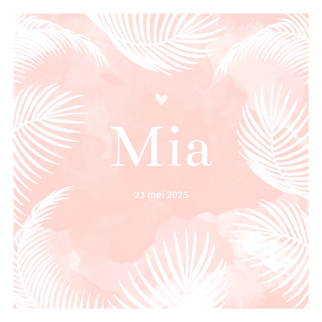 Vierkant roze geboortekaartje met waterverf. Op de achtergrond witte palmtakjes en een hartje. Met de naam van jullie dochter in goudfolie krijgt het kaartje een luxe uitstraling.