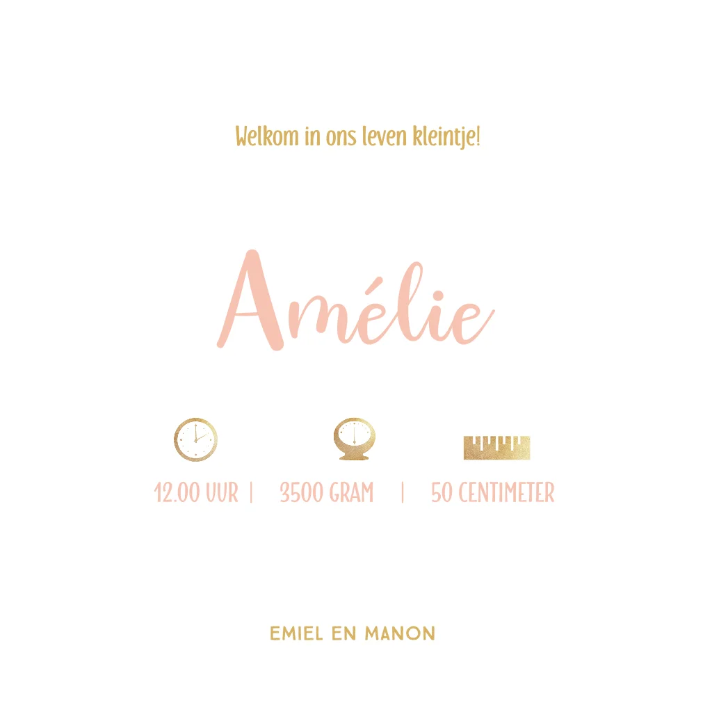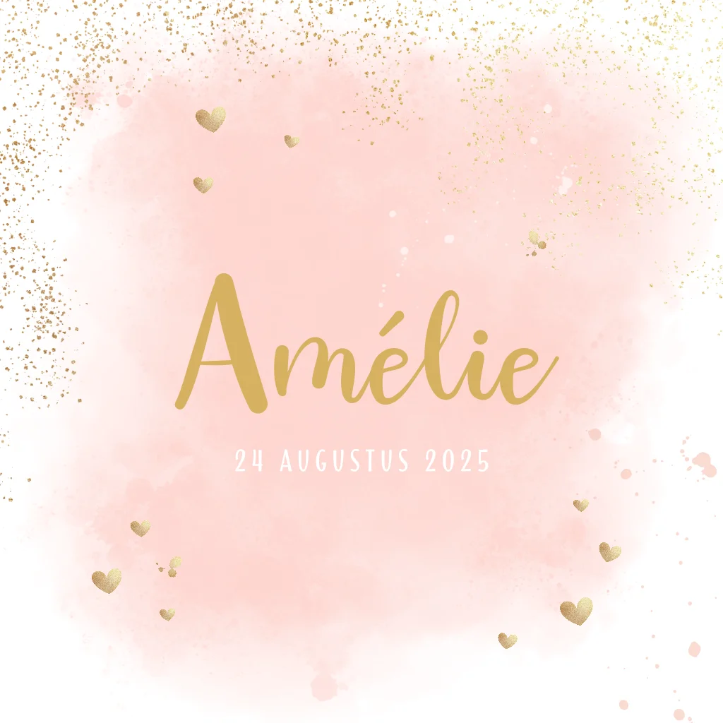 Lief geboortekaartje voor jullie dochter. Op een achtergrond van roze waterverf staat de naam van jullie dochter in goudkleur. De hartjes en confetti in goudkleur maken het kaartje helemaal af. In de editor kun je de kleuren aanpassen en zijn nog veel meer opties voor een uniek kaartje.Bekijk ook ons bijpassend babyborrelkaartje.
