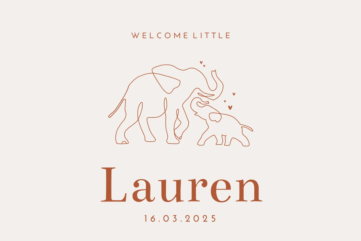 Lief geboortekaartje met hippe lijntekening van een moeder- en baby-olifant in rustige kleuren. Liever een andere kleur of lettertype? Je kunt het ontwerp eenvoudig aanpassen in de online editor en het helemaal naar eigen wens maken.