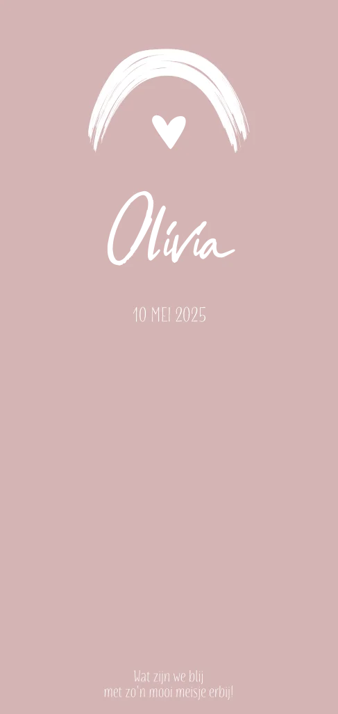 Trendy geboortekaart om de geboorte van jullie dochter aan te kondigen! De regenboog staat op een mooie oudroze achtergrond. De naam en het hartje worden in roségoudfolie gedrukt.