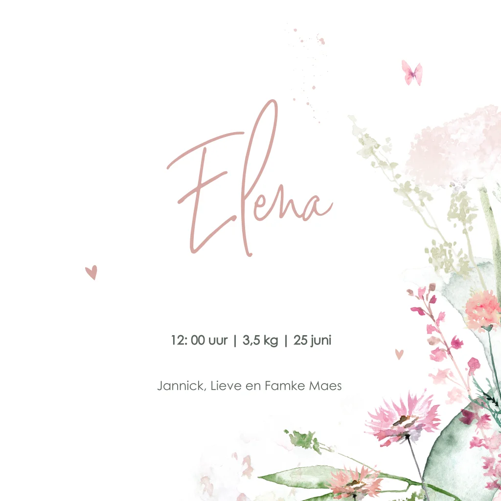 Romantisch geboortekaartje voor een meisje met geschilderde bloemen, vlinders en lieve hartjes. Speciaal aan dit kaartje: de toevoeging van roségoudfolie. Bewerk het kaartje in de editor en kies je favoriete folie kleur.Bekijk ook onze babyborrel uitnodiging.