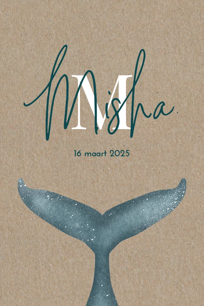 Stoer kaartje voor de geboorte van jullie kindje. De achtergrond is van echt kraftpapier en op de voorgrond staat een sierlijke en stoere walvisstaart. Ook staat de voorletter van jullie kindje op deze kaart. Voor het initiaal staat de naam in een sierlijk lettertype.
