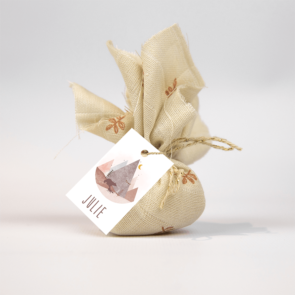 Mooi labeltje die het geboortekaartje of de doopsuikers een leuke extra geeft. Op het label zijn bergen en dieren te zichtbaar in bruin roze tinten!