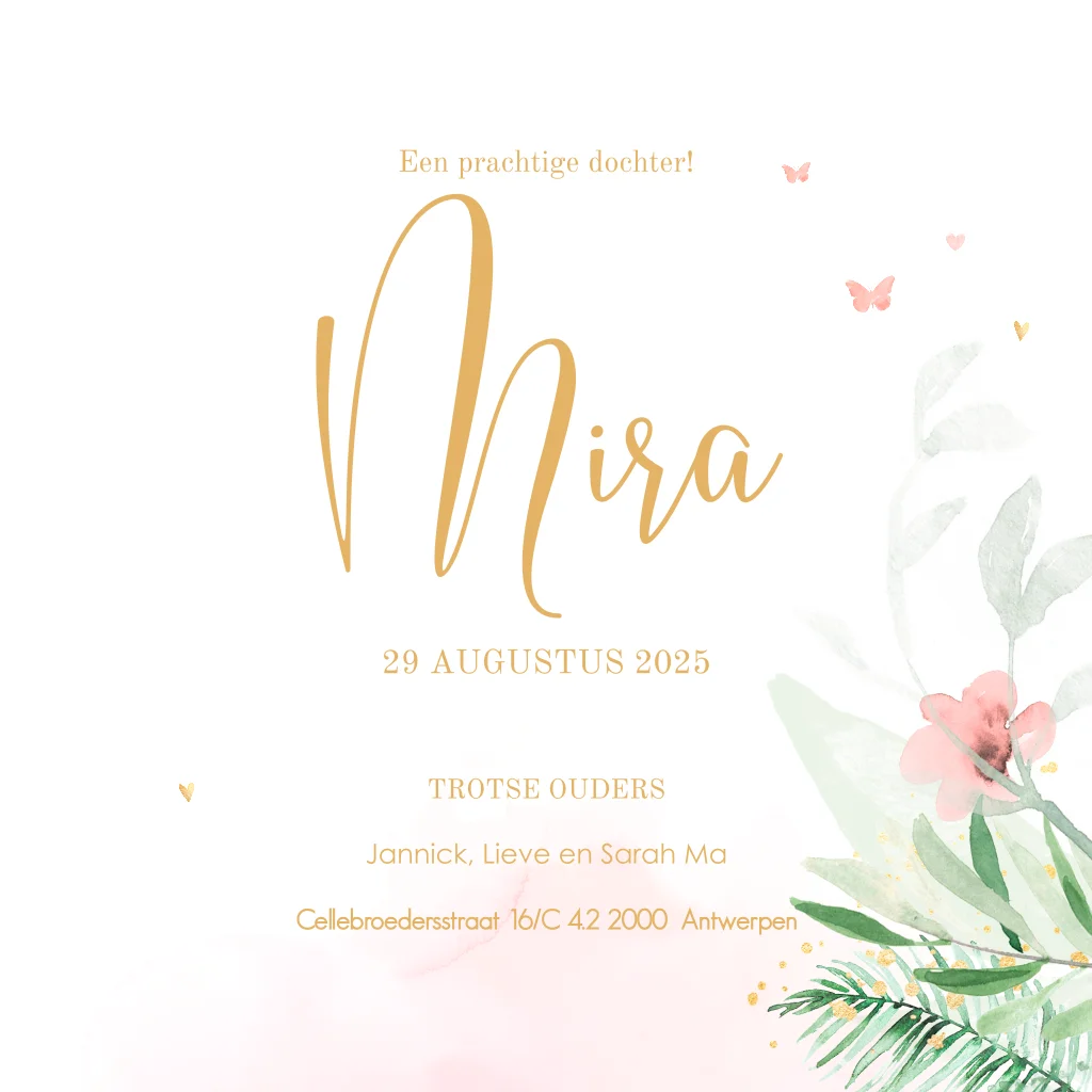 Lief geboortekaartje voor een meisje met bloemen en takjes in de hoeken op wit met roze waterverf vlakken. Op de achtergrond staan roze hartjes. Met de naam van jullie dochter in een leuk lettertype maak je deze kaart helemaal af!