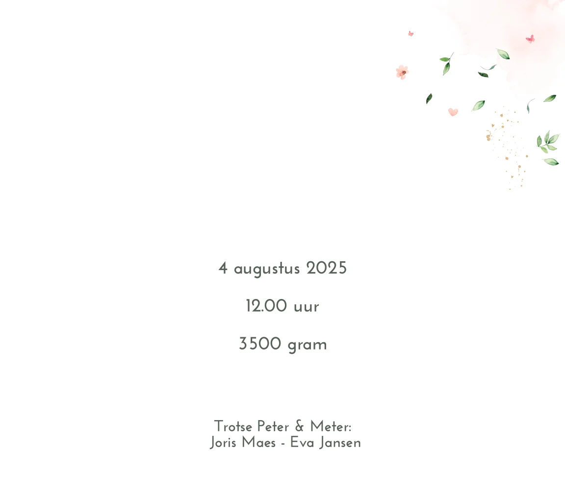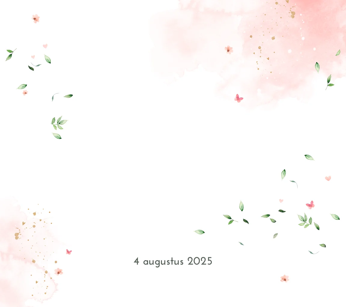 Lief geboortekaartje met de naam in roségoudfolie letters en details van blaadjes en hartjes. Op de achtergrond roze waterverf.