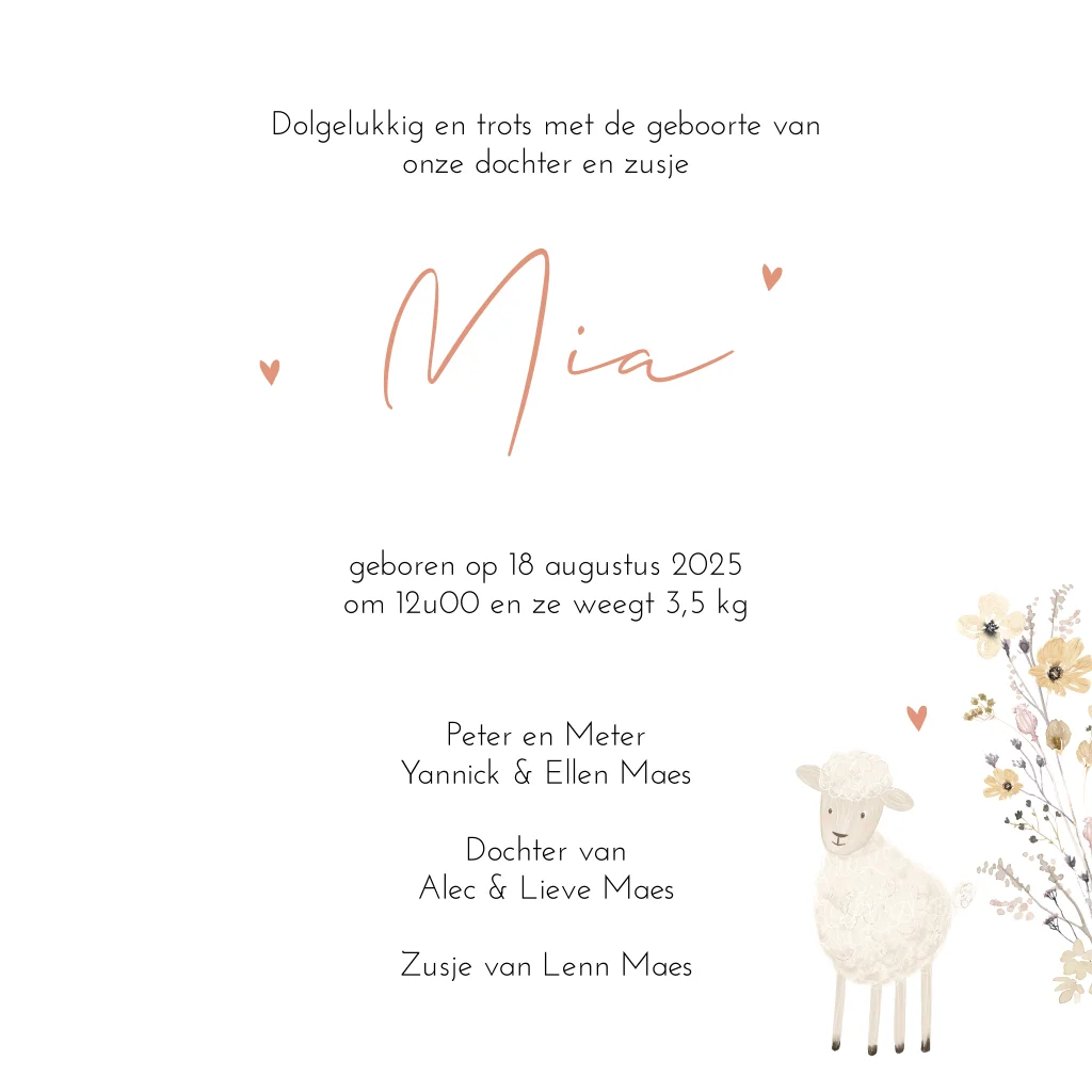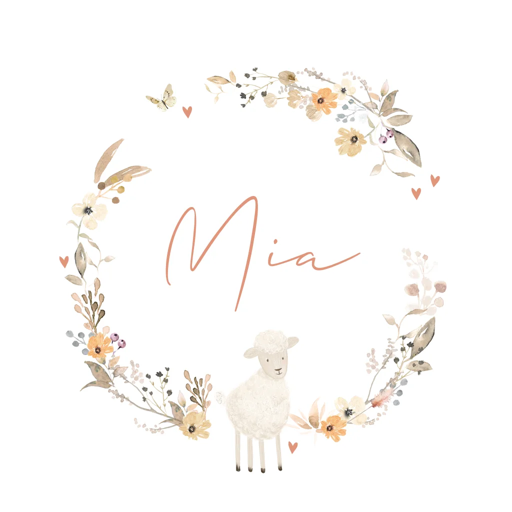 Wat een schattig babykaart voor de geboorte van jullie dochter! Door de bloemenkrans is deze kaart heel stijlvol en het schaapje geeft een lieve uitstraling aan de kaart. Pas de tekst makkelijk aan in de editor.