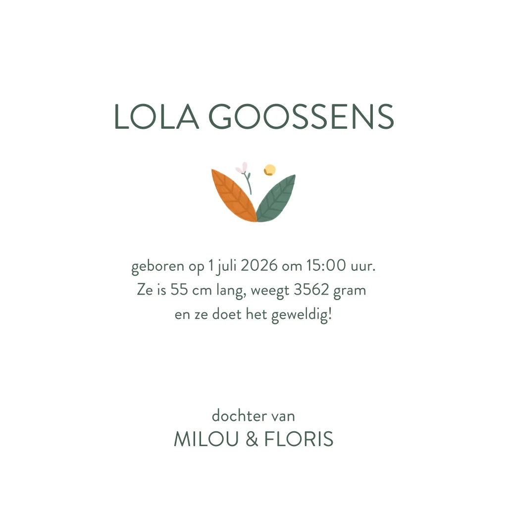 Dit lieve geboortekaartje is het perfecte kaartje voor de geboorte van uw kind. De bloemenkrans zorgt voor een lieve uitstraling, net zoals de schommel met daarop het wiegje.