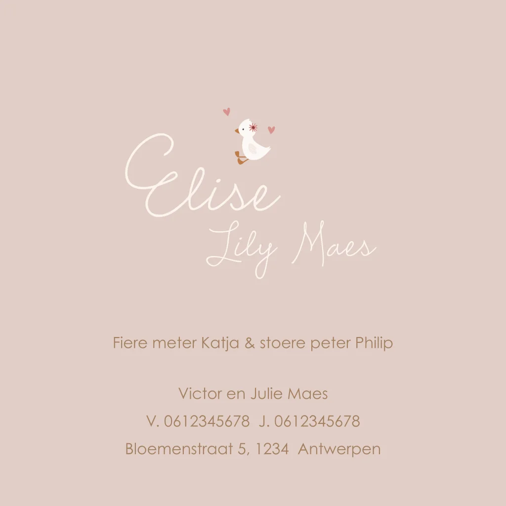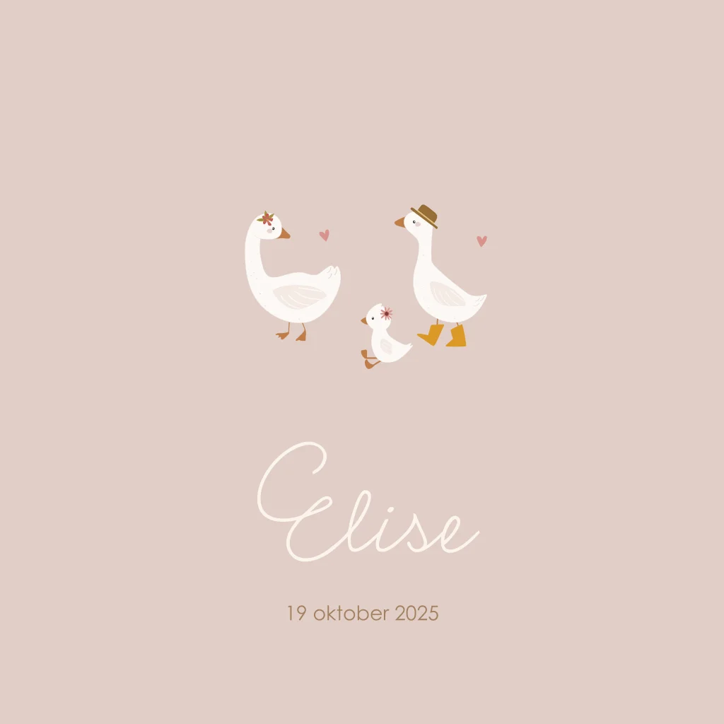 Wat een schattig babykaartje voor een meisje! Op de poeder-roze kaart is een mooie illustratie van een ganzenfamilie te zien met kleine hartjes erboven. De naam staat in een sierlijk bijpassend handschrift. In de editor kunnen de tekst en de kleuren aangepast worden.
