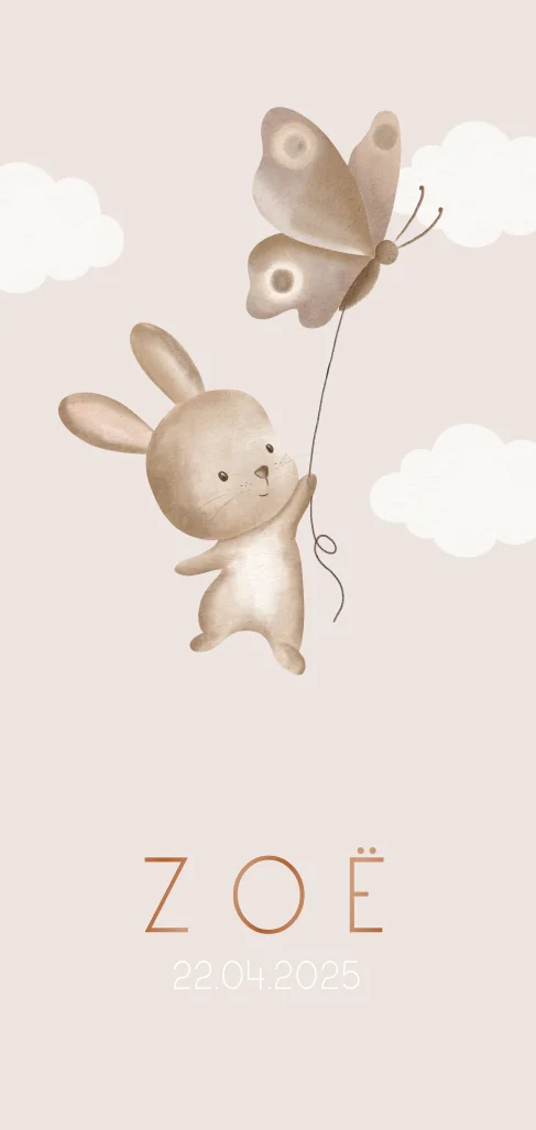 Dit super schattige staande kaartje is perfect voor de geboorte van jullie kleintje. Zet de naam van jullie kindje in hoogglans letters onder het konijntje en de vlinder die zweven tussen de wolken. De zachte kleuren complimenteren elkaar en maken de kaart nog liever.