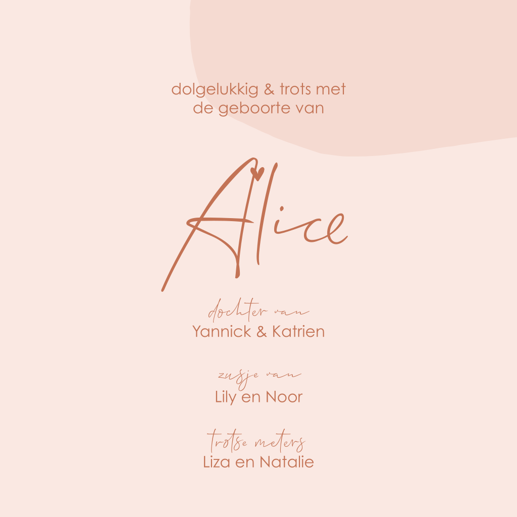 Een lief geboortekaartje met roze organische vormen en roségoudfolie.Deze kaart is nu toegevoegd aan je eigen collectie.