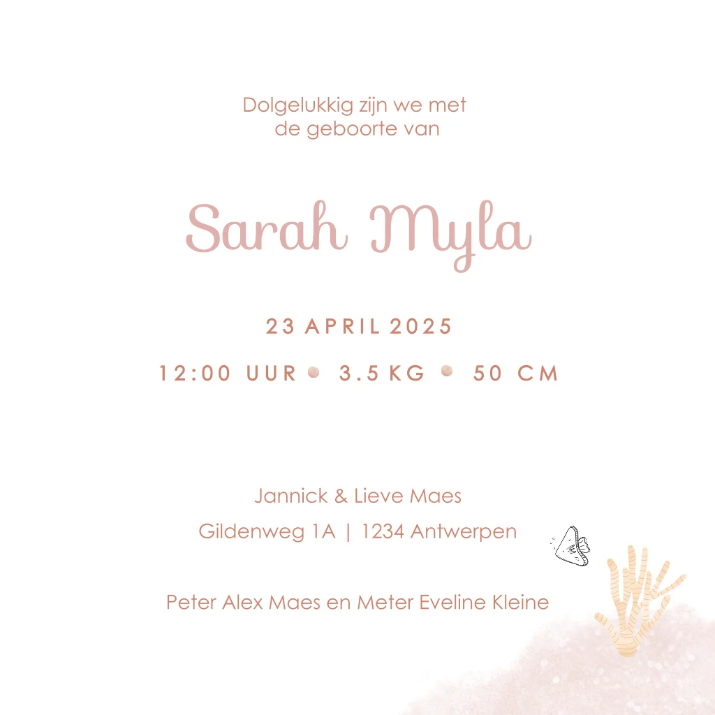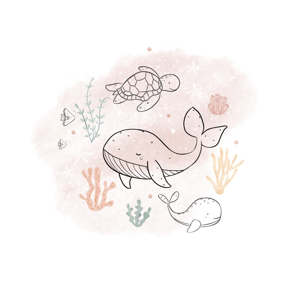 Geboortekaartje voor een meisje, met lijntekening van walvissen en schildpad. Op de achtergrond roze waterverf en de naam is afgedrukt in roségoudfolie.Totaalprijs: 0 |