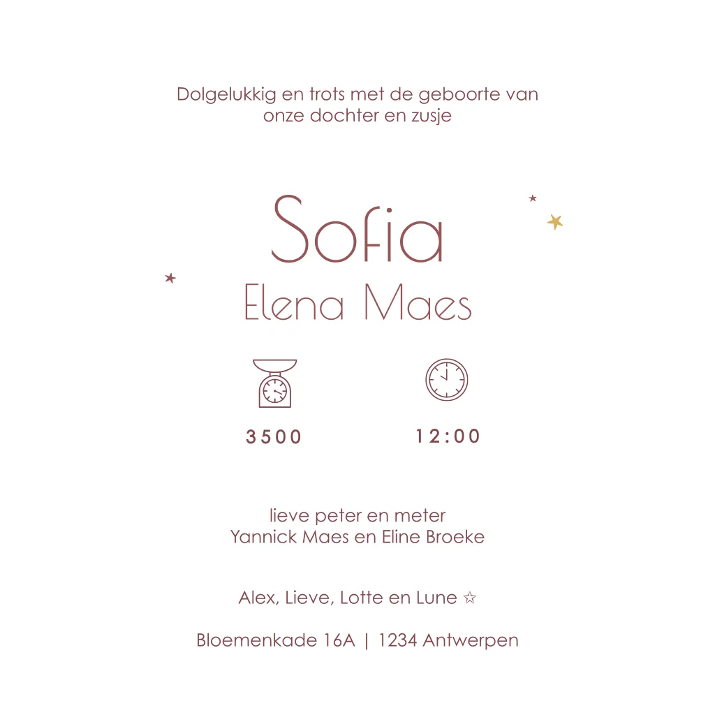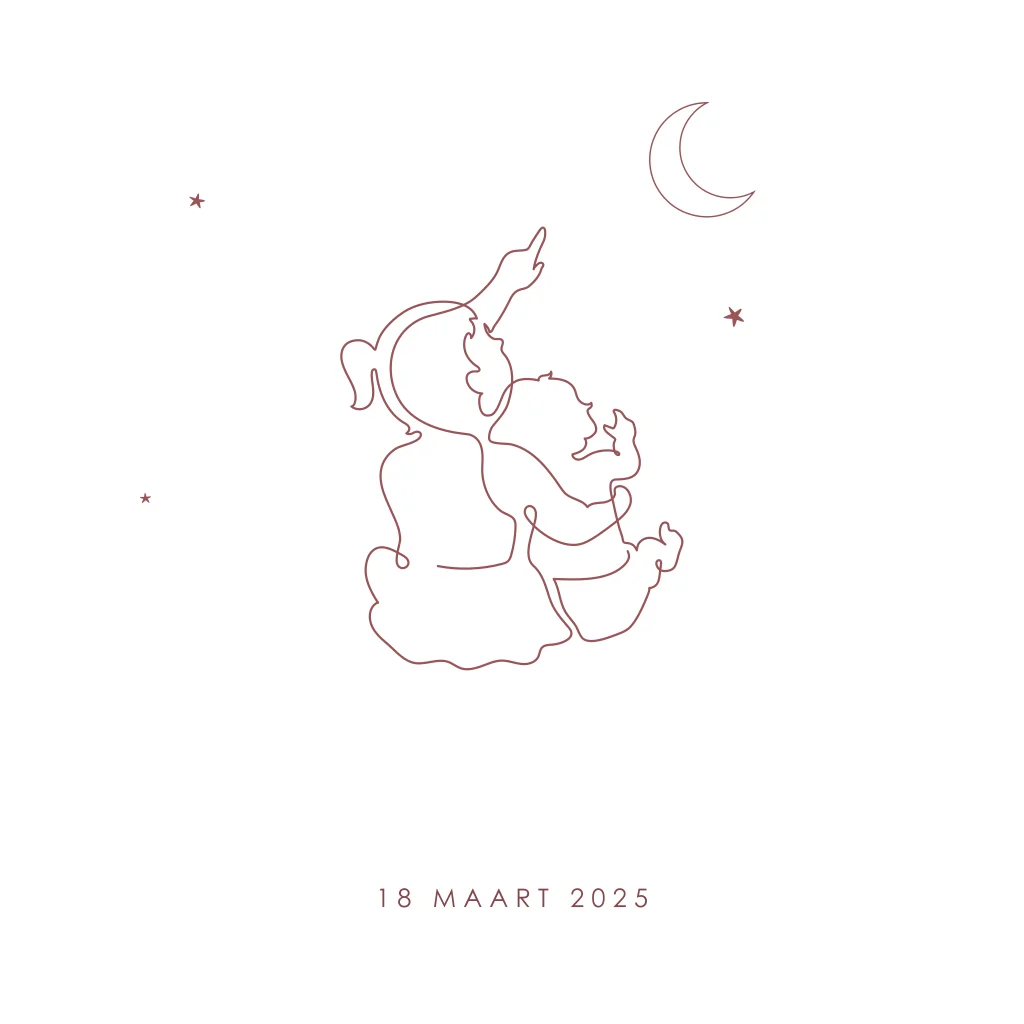 Een lief geboortekaartje met een lijntekening van een grote zus samen met haar kleine zusje wijzend naar de maan en sterren. Personaliseer dit kaartje in de online editor volledig naar eigen wens!| Totaalprijs: 0 |