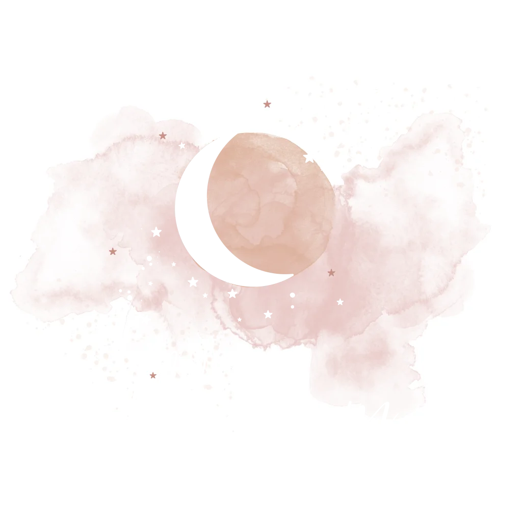 Een lief geboortekaartje met een maan en sterren van goudfolie. De achtergrond heeft een roze waterverf-look.