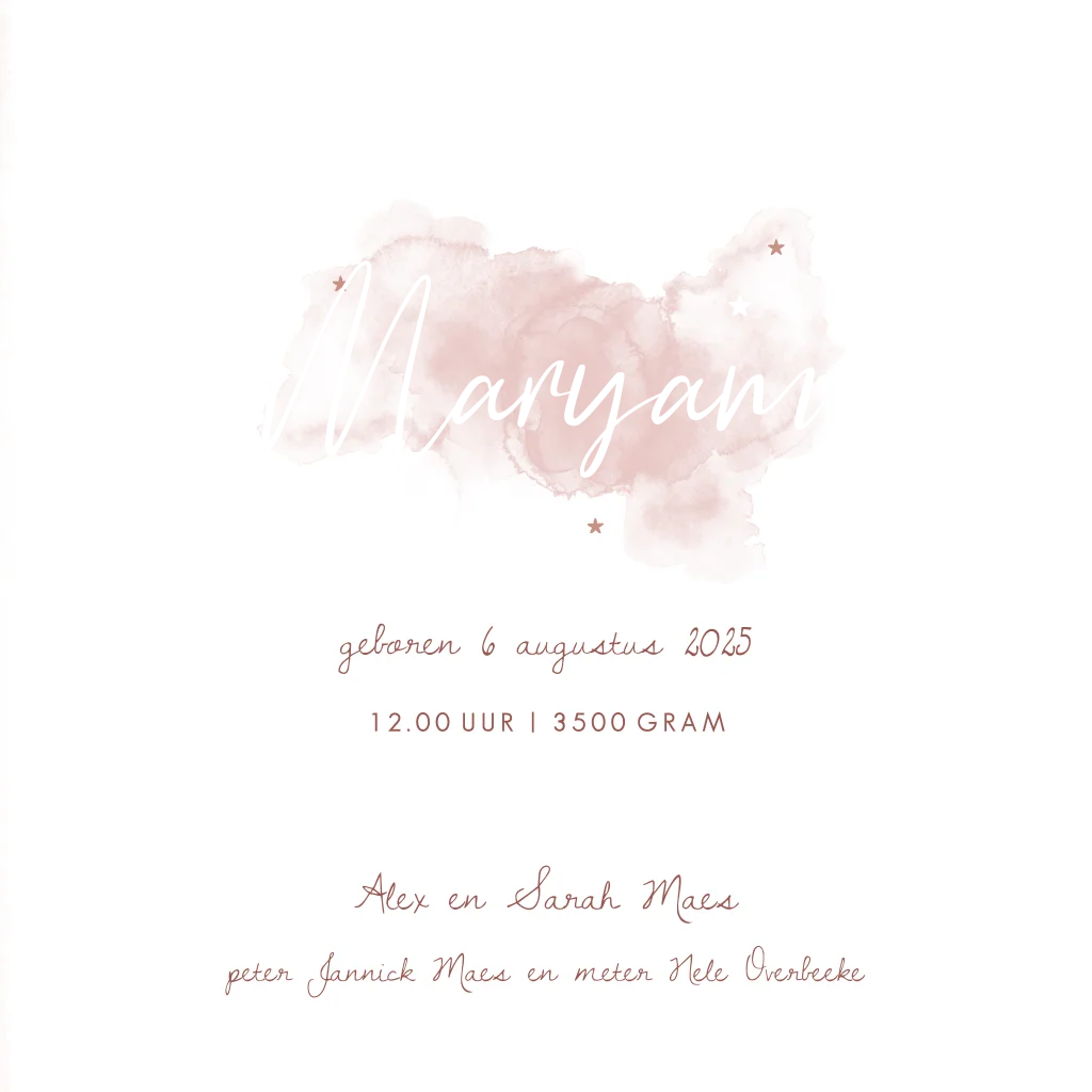 Een lief geboortekaartje met een maan en sterren van goudfolie. De achtergrond heeft een roze waterverf-look.Totaalprijs: 0 |