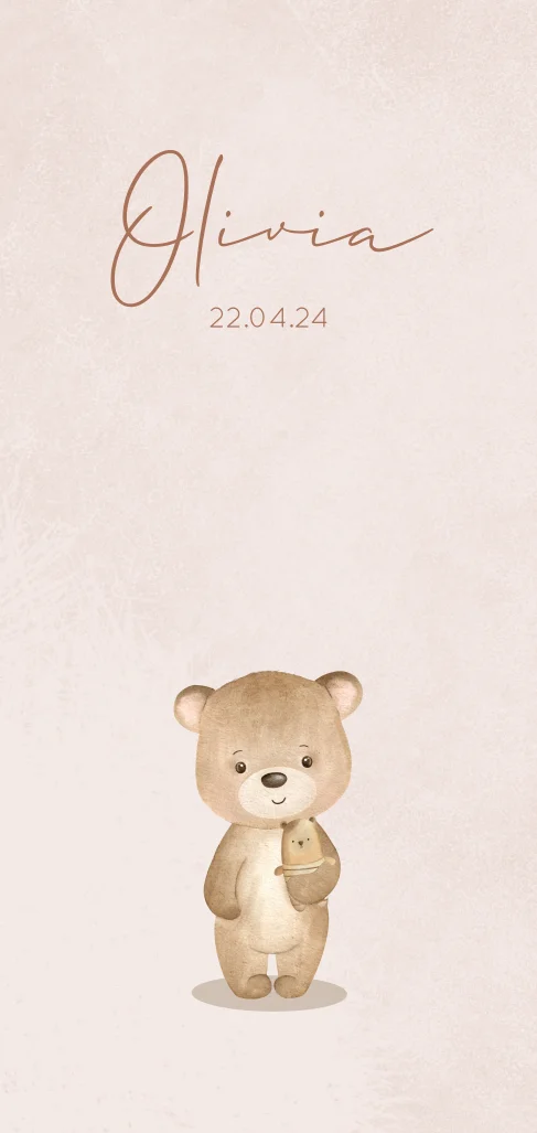 Een schattig geboortekaartje voor jullie pasgeboren meisje. De kaart is voorzien van sierlijke letters en een lief beertje dat een knuffeltje vasthoudt.