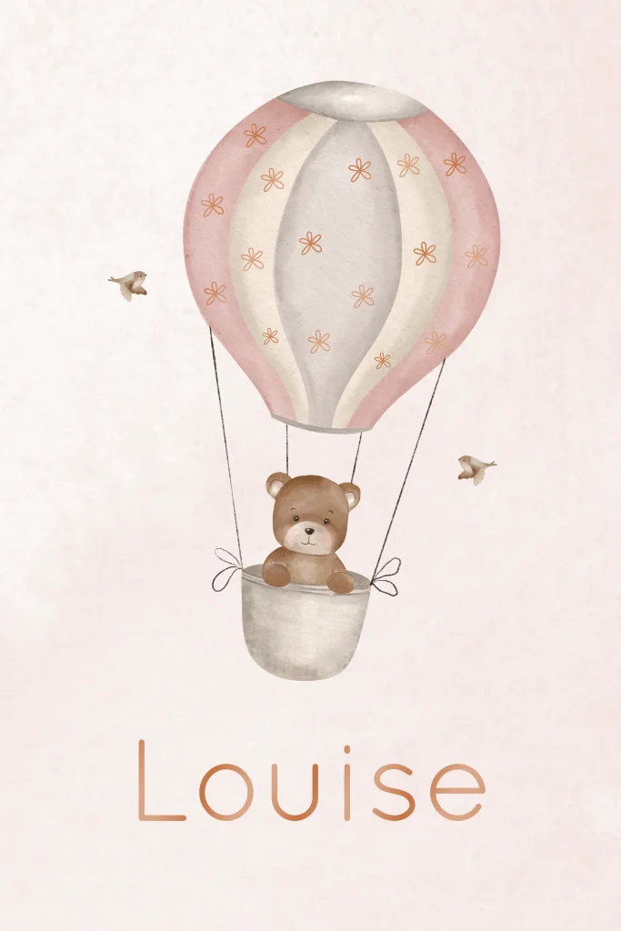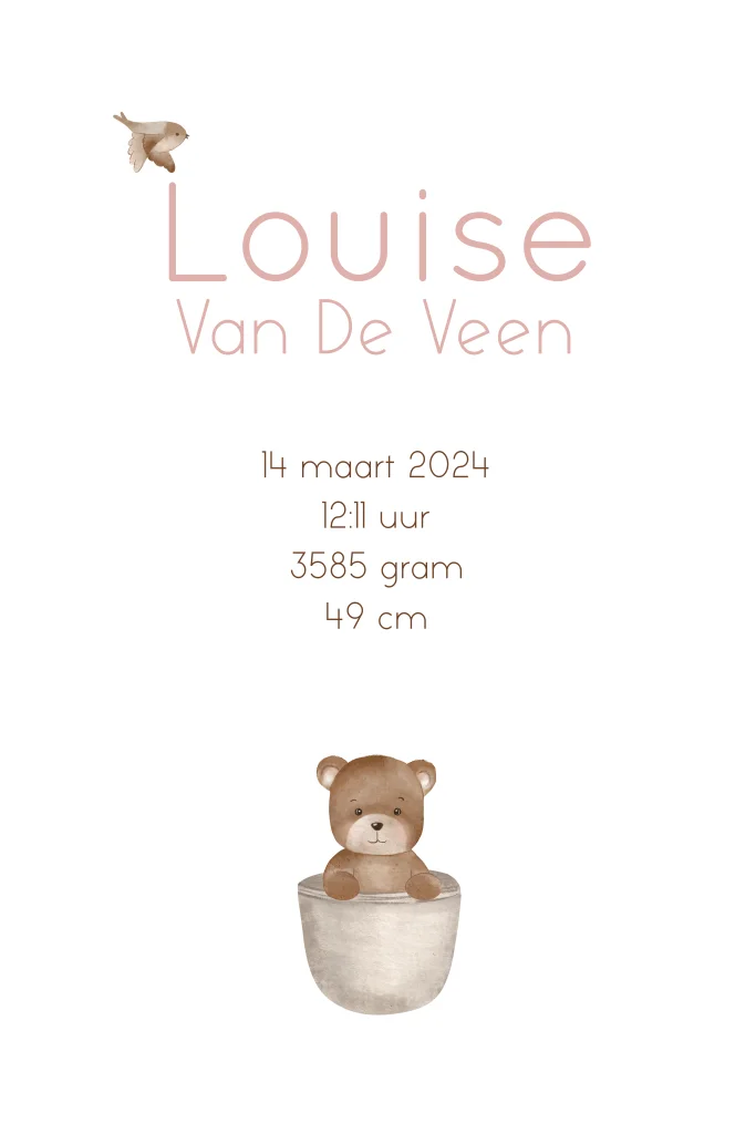 Op dit kaartje vliegt een klein beertje door een lichtroze lucht in een luchtballon. Er vliegen ook twee vogeltjes mee. De naam onder de luchtballon wordt in hoogglans gedrukt. De zachte kleuren maken dit geboortekaartje extra lief.