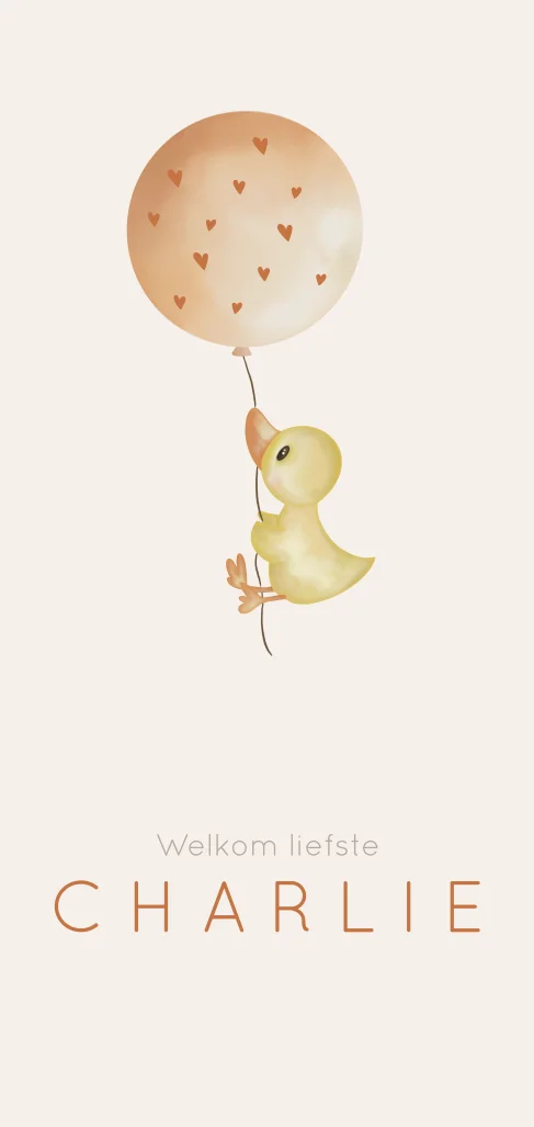 Dit super lieve kaartje is speciaal voor de geboorte van een meisje. Een eendje lijkt te vliegen aan een oranje ballon. Deze kleurt heel mooi bij de beige achtergrondkleur. Het langwerpige formaat en de ronde hoeken maken dit geboortekaartje helemaal af.